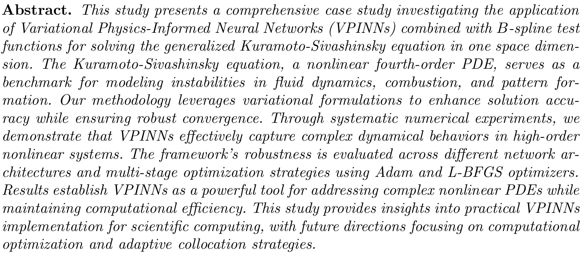 Keywords: Kuramoto-Sivashinsky equation, VPINNs, B-splines, numerical analysis, nonlinear, variational methods, scientific computing